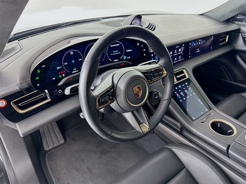 2020 Porsche Taycan Turbo S in Volcano Grey Metallic with Leather Interior in Black. Under Porsche Approved Certified Pre-Owned Warranty for 2 Years and Unlimited Miles from Date of Purchase. Premium Package: Ionizer, Seat Ventilation (front), Storage Package, Fixed Panoramic Roof in Glass, Thermally and Noise Insulated Glass, Surround View, and Lane Change Assist. Also Features: SportDesign Package in Carbon Fiber, Power Folding Exterior Mirrors, Exterior Mirror Upper Trim in Carbon Fiber, Under Door Puddle Light Projectors, "Taycan Turbo S" Logo on Doors in Aurum, Porsche Ceramic Coated Brakes with Calipers in High Gloss Black, Wheels Painted in Satin Aurum, Power Seats (14-way) with Memory Package, Interior Accents in Neodyme, Sport Chrono Stopwatch Dial in Bordeaux Red, Rear 2+1 Seats, Advanced 4-Zone Climate Control, Center Console Armrest with "PORSCHE" Logo, Steering Wheel Trim in Matte Carbon FIber and Steering Wheel Heating, Passenger Display, Burmester 3D High End Surround Sound System, On-Board 150 kW DC Charger, Porsche Intelligent Range Manager, Mobile Charger Connect, LED-Matrix Headlights in Glacier Blue incl PDLS+, and Porsche InnoDrive incl Adaptive Cruise Control. Available at Porsche Grapevine 1280 Texan Trail Grapevine TX 76051.