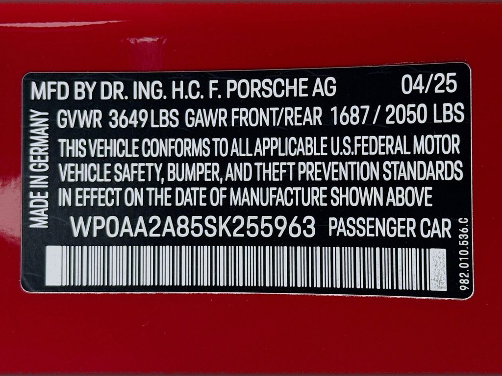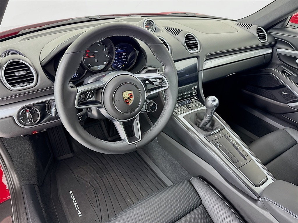 2025 Porsche 718 Cayman Style Edition in Carmine Red with Leather Interior in Black with Deviated Stitching in Chalk. Under Porsche Approved Certified Pre-Owned Warranty for 2 Years and Unlimited Miles from Expiration of Porsche New Vehicle Warranty. New Vehicle Warranty Start Date is 8/18/2025. Premium Package: Ventilated Seats, Power Folding Exterior Mirrors incl Courtesy Lighting, Lane Change Assist, Porsche Entry and Drive, Light Design Package, and Luggage Net in Passenger Footwell. Also with: Exterior Package Painted, Exclusive Design Fuel Cap, Deletion of Exterior Decal Set, 6-Speed Manual Transmission with Sport Chrono Package, Locking Wheel Bolts, Power Steering Plus, Power Sport Seats (14-way) with Memory Package, Seat Belts in Chalk, Electric Steering Column, Navigation including Porsche Connect, Smartphone Compartment, Voice Control, BOSE Surround Sound System, and Smoking Package. Available at Porsche Grapevine 1280 Texan Trail Grapevine TX 76051.