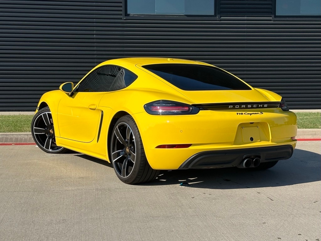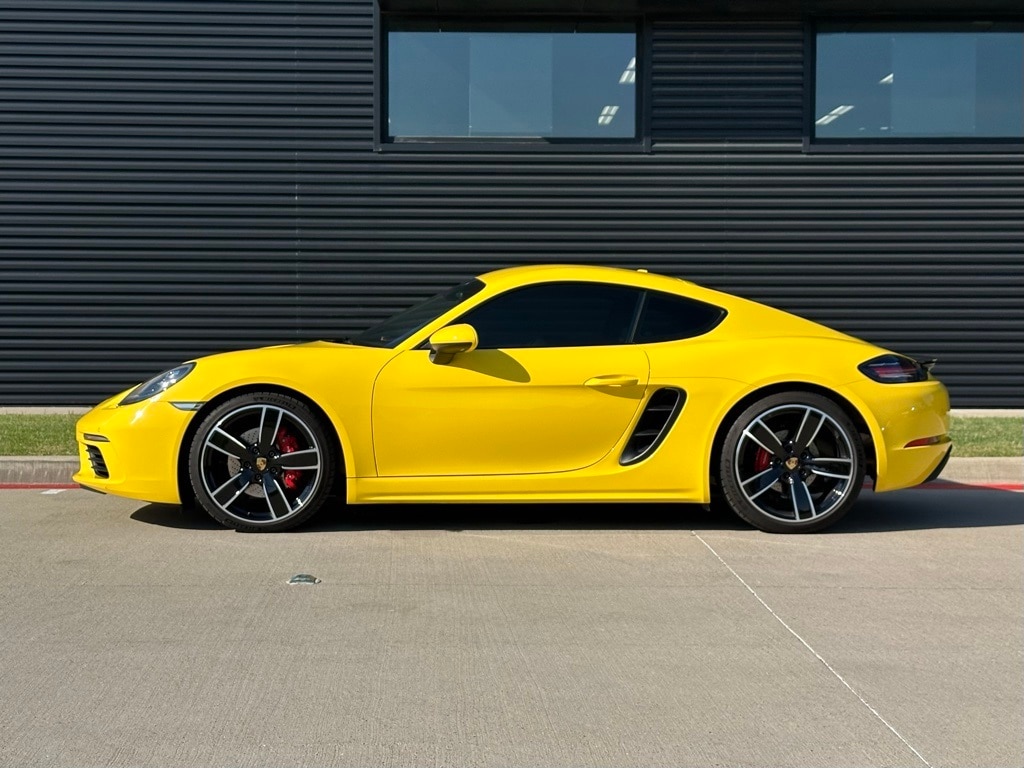 2025 Porsche 718 Cayman S in Racing Yellow with Interior in Black. Under Porsche Approved Certified Pre-Owned Warranty for up to 3 Years and Unlimited Miles from Expiration of Porsche New Vehicle Warranty. New Vehicle Warranty Start Date is 3/27/2025. Premium Package: Ventilated Seats, Heated Multifunction Steering Wheel, Power Folding Exterior Mirrors incl Courtesy Lighting, Pane Change Assist, Porsche Entry and Drive, Light Design Package. Also with: Model Designation on Rear in High Gloss Black, Rear Wing in High Gloss Black, Sport Tailpipes in Black, Wheels Painted in High Gloss Black, 20" Carrera Sport Wheels, Instrument Dials in Racing Yellow, Electric Steering Column, Navigation Including Porsche Connect, and Voice Control. Available at Porsche Grapevine 1280 Texan Trail Grapevine TX 76051.