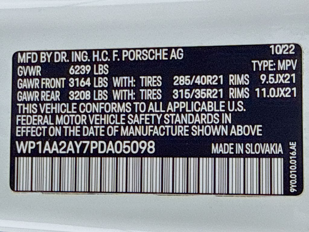 2023 Porsche Cayenne Platinum Edition in White with Interior in Black. Under Porsche Approved Certified Pre-Owned Warranty for2 Years and Unlimited Miles from Expiration of Porsche New Vehicle Warranty. New Vehicle Warranty Start Date is 3/8/2023. Premium Package Plus: Power Seats (14-way) with Comfort Memory, Heated Seats (front and rear), Ventilated Seats (front), 4-Zone Climate Control, and Lane Change Assist. Also with: Roof Rails in High Gloss Black, Under Door Puddle Light Projectors, Trailer Hitch, 21'' Cayenne Exclusive Design Wheels in Jet Black Metallic, Heated Steering Wheel, Surround View, and Soft Close Doors. Available at Porsche Grapevine 1280 Texan Trail Grapevine TX 76051.